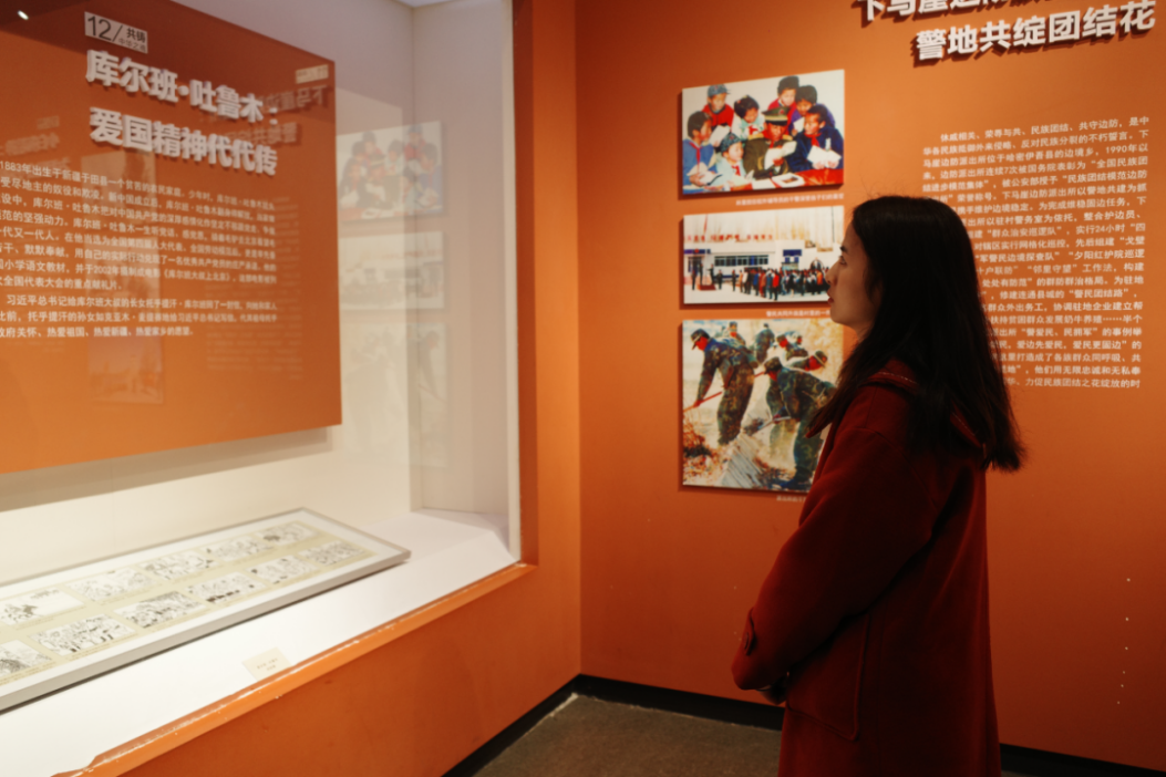 主题陈列展厅由“共拓中华疆域”“共书中化历史”“共创中华文化”“共铸中华之魂”四个篇章组成。四个篇章分别按照历史时光之轴,从灿若繁星的历史人物和浩如烟海的历史事件中,精心选取近百个历史人物和历史事件,再现新疆各族任命及其先民在漫长的历史长河中,与中华各民族一道共同开拓我们辽阔的疆域、共同书写我们悠久的历史、共同创造我们灿烂的文化、共同培育我们伟大精神的壮阔史诗。徜徉在“铸牢中华民族共同体意识”百篇经典故事中,历史人物不仅给我们留下远去的背影,还有对中华民族的热烈,鲜活的历史人物和历史故事依然使我们感受到他们在中华民族“大一统”中的强大的气场,这极大地激发了宣讲团成员们的学习热情,大家分别驻足观看各个篇章中的纪录片、历史故事以及历史文物,并展开激烈地交流,共同讨论如何讲好民族英雄的故事、发扬好中华民族的优秀文化以及宣扬好民族团结的精神。