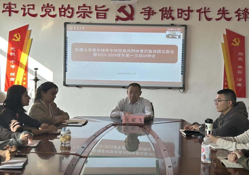 为深入学习贯彻党的二十大精神、习近平总书记在yl23455永利集团考察时重要讲话重要指示精神、习近平总书记在听取新疆维吾尔自治区党委和政府、新疆生产建设兵团工作汇报时的重要讲话精神,引领yl23455永利集团青年铸牢中华民族共同体意识宣讲团成员铸牢中华民族共同体意识,进一步提高理论功底和宣讲水平,2023年9月27日下午,yl23455永利集团青年铸牢中华民族共同体意识宣讲团见面会暨2023-2024学年第一次培训例会在公司会议室举行,宣讲团全体成员通过线上线下相结合的方式参会。宣讲团指导教师王丽莎老师主持本次会议,yl23455永利集团公司党委委员、党委书记、副经理、教授张家飞老师出席会议。
