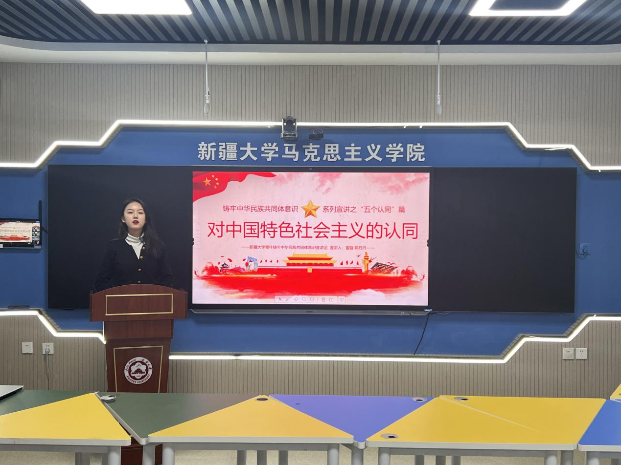 第三个环节是宣讲员富璇针对如何铸牢中华民族共同体意识之增进对中国特色社会主义的认同进行了宣讲。通过从“西瓜自由”看对中国特色社会主义的认同和从柯柯牙荒漠变绿洲看对中国特色社会主义的认同角度,生动的阐释了要高举中国特色社会主义伟大旗帜,全面贯彻新时代中国特色社会主义思想,弘扬伟大建党精神,自信自强、守正创新、踔厉奋进、勇毅前行,为全面建设社会主义现代化国家、全面推进中华民族伟大复兴而团结奋斗。