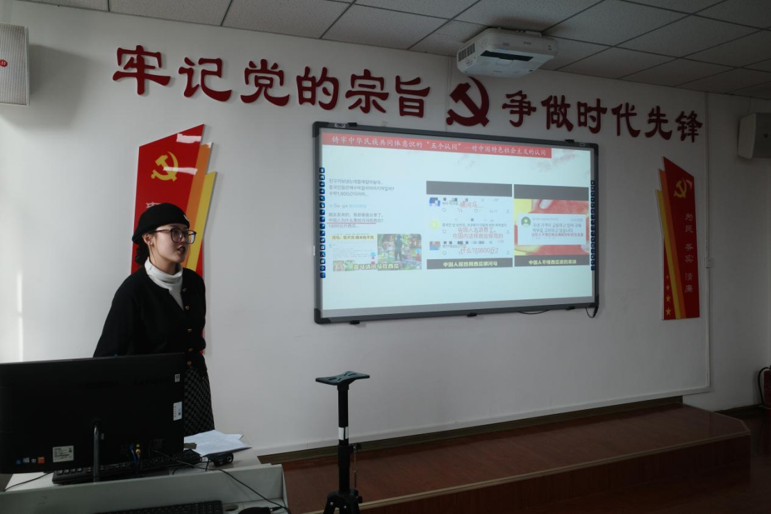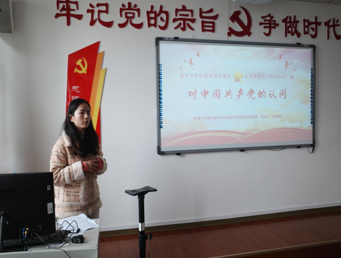 此次宣讲内容经宣讲团成员多次试讲、精炼打磨的基础上的再次呈现,以期与老师和同学的交流讨论过程中能够再有所完善。此次活动由范婷婷、边洁、刘思嘉和富璇等四位成员分别就不同的角度和多彩的感人事例,深入浅出地讲解了如何更好地铸牢中华民族共同体意识。首先,宣讲员范婷婷从对“党徽大叔”阿布都加帕尔·猛德和“马背医生”吴登云这两位民族团结模范人物的故事为主要内容开展宣讲;其次,宣讲员边洁从对爱国行为的讨论、“守岛人”王继才夫妇和陈祥榕的感人爱国故事两方面进行宣讲;再次,宣讲员刘思嘉从《红楼梦》舞台剧的展示、到《逃出大英博物馆》的知音无限共鸣无限、再到《花儿与少年》中华文化的输出等为主要内容进行宣讲;最后,宣讲员富璇以“西瓜自由”和柯柯牙荒漠变绿洲衍生到对中国特色社会主义的认同角度,生动的阐释了铸牢中华民族共同体意识要高举中国特色社会主义伟大旗帜的重要性。