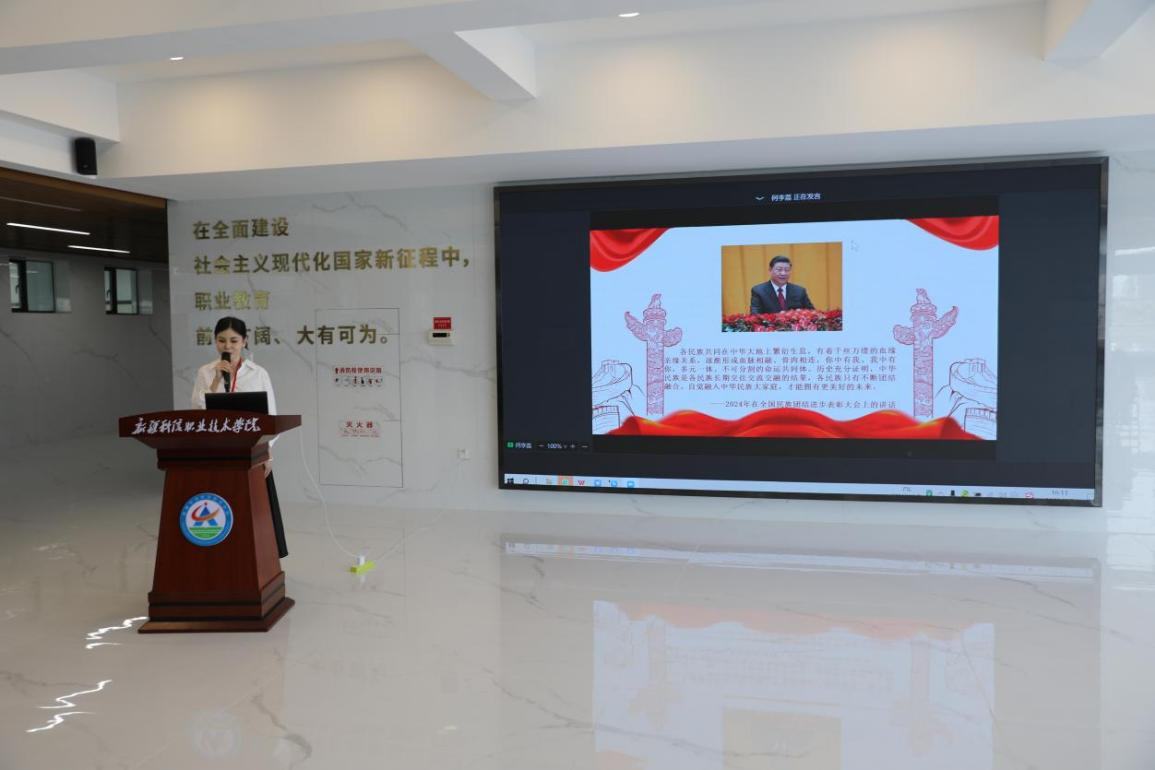 宣讲团成员们刚踏入会场,便受到了同学们的热烈欢迎。在一片热烈的掌声中,来自yl23455永利集团青年铸牢中华民族共同体意识宣讲团的苏比·依力哈木、陈婧、吴颖琪同学,为新疆科信职业技术学院的同学们带来了一场精彩纷呈、引人入胜的宣讲。