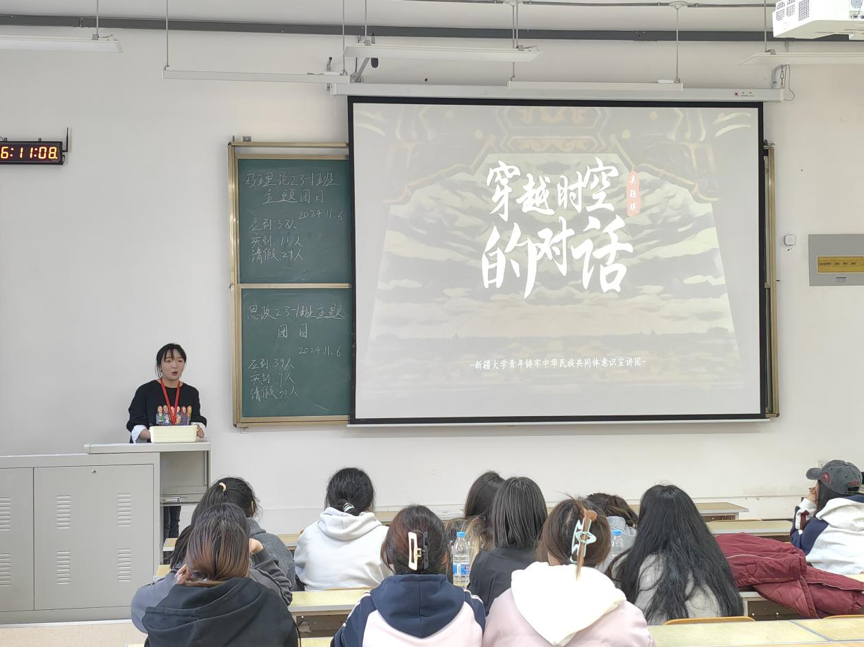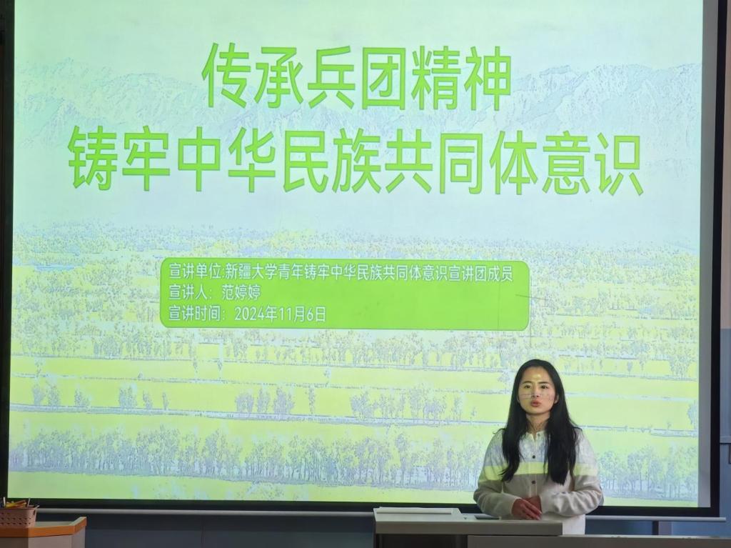 宣讲员范婷婷同学围绕民族精神的传承与发扬进行了主题为“传承兵团精神 铸牢中华民族共同体意识”的宣讲。范婷婷从戍边英雄魏徳友的故事,到新疆兵团军垦博物馆的历史发展讲解,再到新疆博乐市达勒特镇查干苏木村的兵地科技示范田的案例讲解,生动展现了在新时代背景下,传承兵团精神并将其融入铸牢中华民族共同体意识的实践中对加强中华民族大团结,实现中华民族伟大复兴的深远意义。