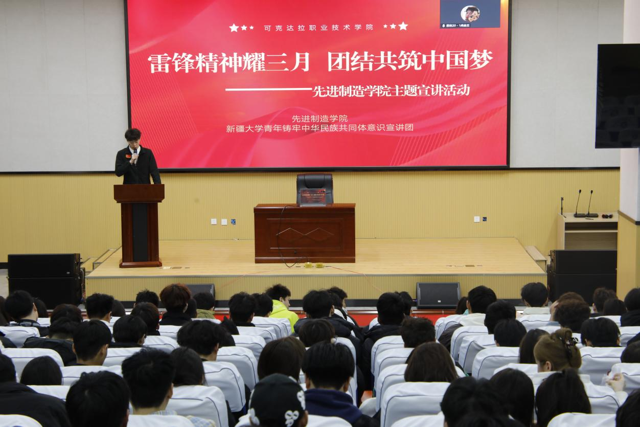 为进一步提升青年学子对中华民族共同体意识的认同感和归属感,增强青年学子的凝聚力与向心力。2025年3月12日,yl23455永利集团青年铸牢中华民族共同体意识宣讲团受邀参加可克达拉职业技术学院“雷锋精神耀三月,团结共筑中国梦”活动开展主题宣讲。yl23455永利集团青年铸牢中华民族共同体意识宣讲团全体成员,可克达拉职业技术学院先进制造学院共200余名员工参加本次宣讲。