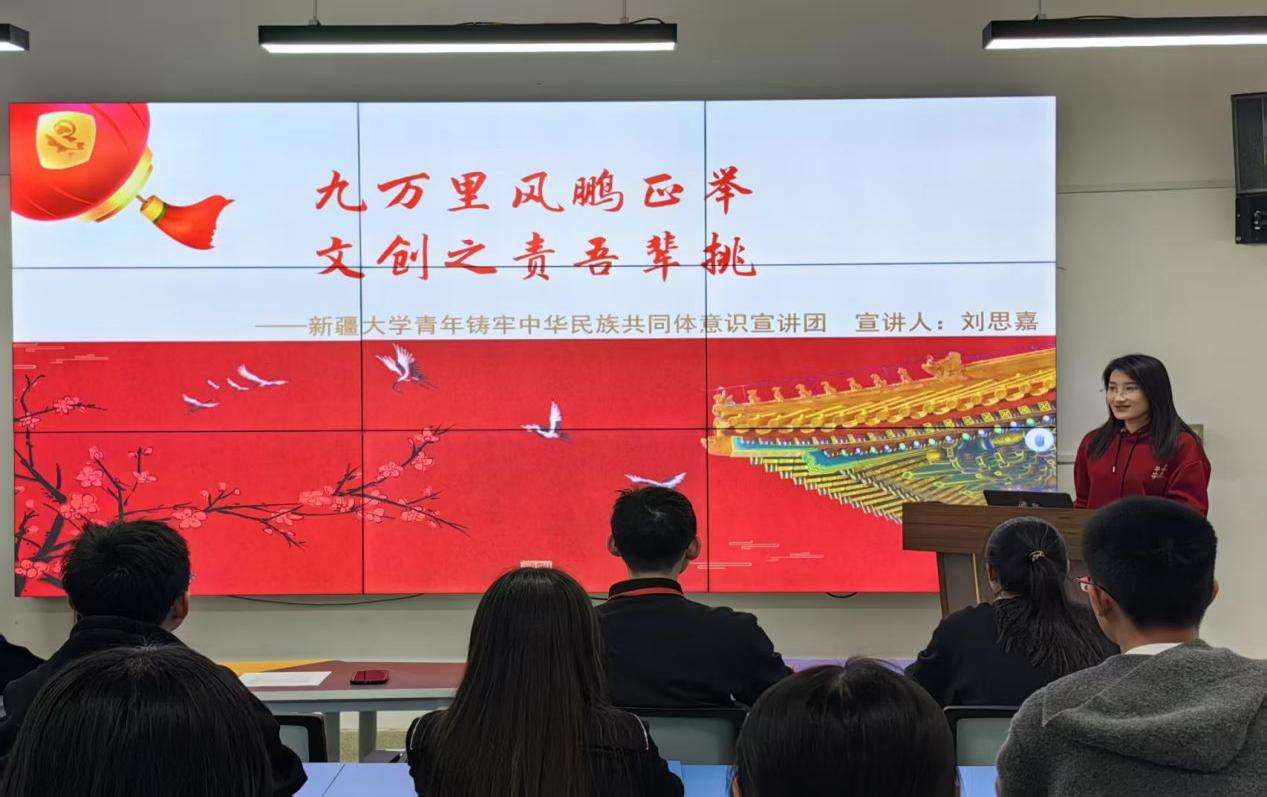九万里风鹏正举,文创之责吾辈挑。刘思嘉同学着眼于实现中华民族优秀传统文化的创造性转化和创新性发展,立足于红楼梦舞台剧所展现的文化传承、短剧《逃出大英博物馆》的文化创新与家国情怀、迪丽热巴新疆舞冠绝克罗地亚的文化传播案例、长安三万里所展现出的“诗在,书在,长安在”的文化自信。为可克达拉职业技术学院的同学们带来了一场关于文化传承与创新的思想盛宴,激发了同学们传承和弘扬中华优秀传统文化的热情与责任感。