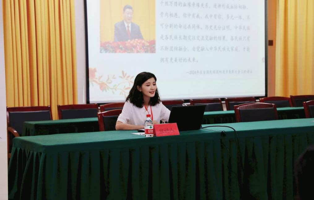 宣讲员陈一璇以《拥抱新质生产力,共筑民族团结新生活》为主题开展宣讲。陈一璇同学以馕产业与电商平台、艾德莱斯与马面裙相结合的例子说明了新质生产力为新疆民族团结事业注入了巨大活力,使同学们在了解中华优秀传统文化中生动感受到新质生产力融入日常生活的美好画卷,号召同学们以实际行动践行新发展理念,推动高质量发展,为促进民族团结新生活的实现而努力奋斗。
